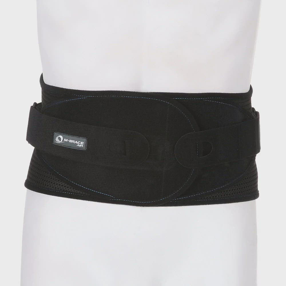 The M-Brace 505 features semi-rigid fabric construction with self-modeling flexible stays and sliding rigid straps. The innovative front-locking system creates effective lumbar-sacral immobilization when secured.